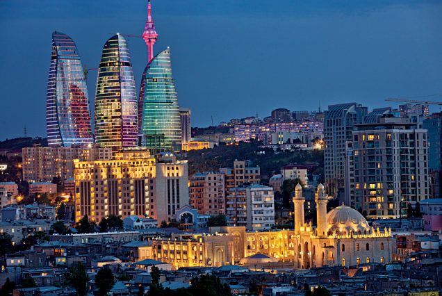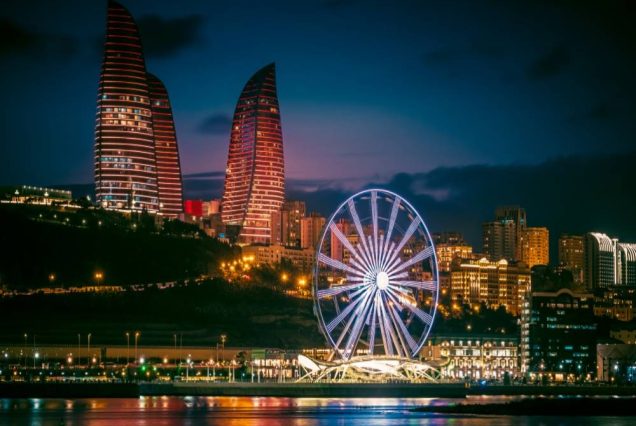 • 🌆 باكو مدينة حديثة ساحرة بشوارعها النظيفة وأبراج اللهب المضيئة ليلًا.